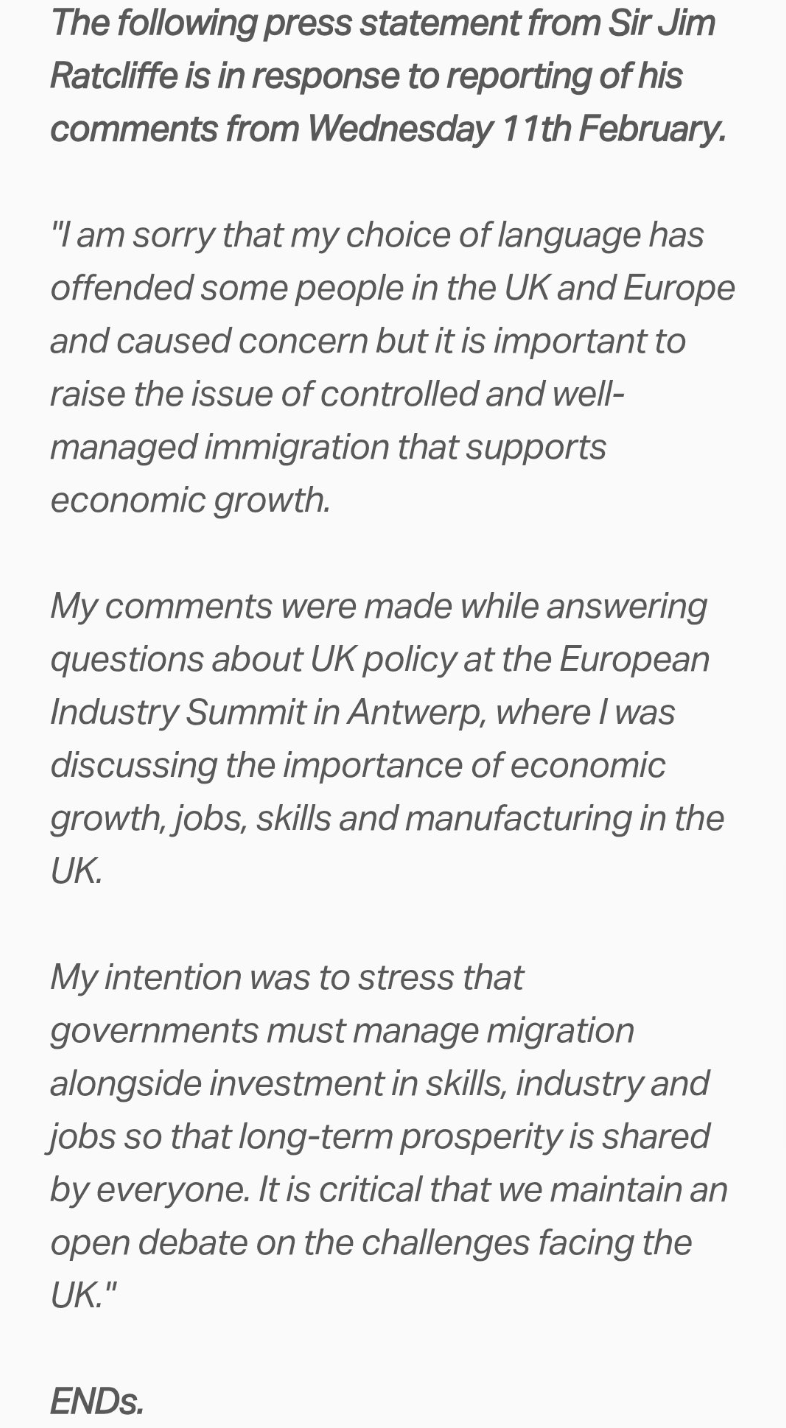 “Siento si la elección de mis palabras ha ofendido a alguna gente en el Reino Unido y en Europa y si ha creado preocupación, pero es importante hablar del problema de la inmigración controlada y de su apoyo al crecimiento de la economía”, dijo Ratcliffe, que fijó en 2020 su residencia en Mónaco.