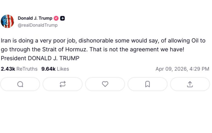 “Irán está haciendo un trabajo muy deficiente- deshonroso, dirían algunos- al permitir el paso del petróleo a través del estrecho de Ormuz. ¡Ese no es el acuerdo que tenemos!“, escribió el republicano en un breve mensaje en su red social Truth Social.